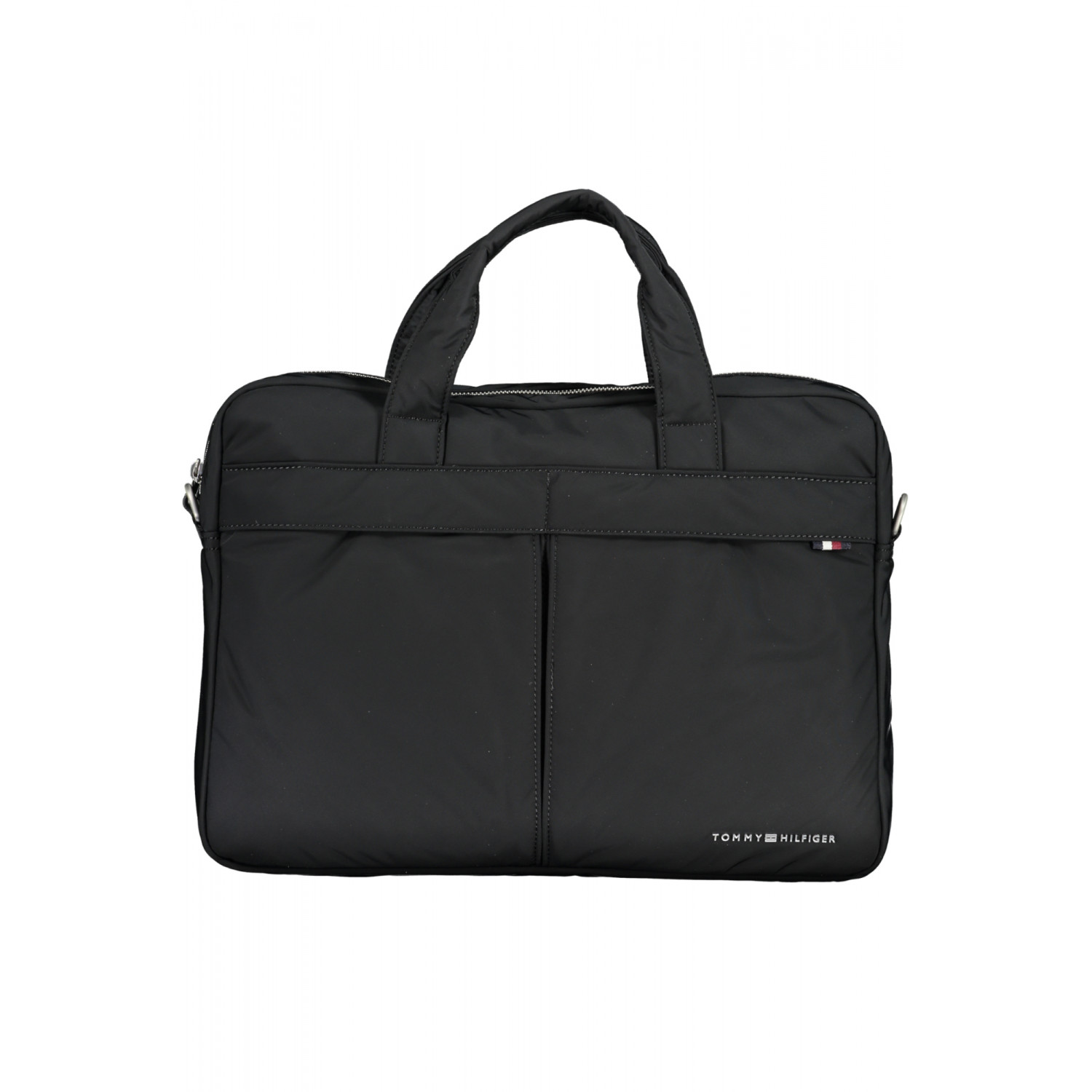 CARTELLA 2 MANICI, TRACOLLA REGOLABILE E REMOVIBILE, 3 TASCHE ESTERNE, 1 SCOMPARTO INTERNO PORTA LAP-TOP, 1 TASCA INTERNA, SPAZI INTERNI PORTAPENNE, CHIUSURA CON ZIP E AUTOMATICO, LOGO, 50% POLYESTER RECYCLED