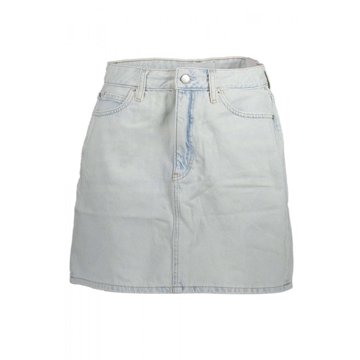 GONNA CORTA IN JEANS, 5 TASCHE, EFFETTO SLAVATO, BOTTONE, ZIP, LOGO